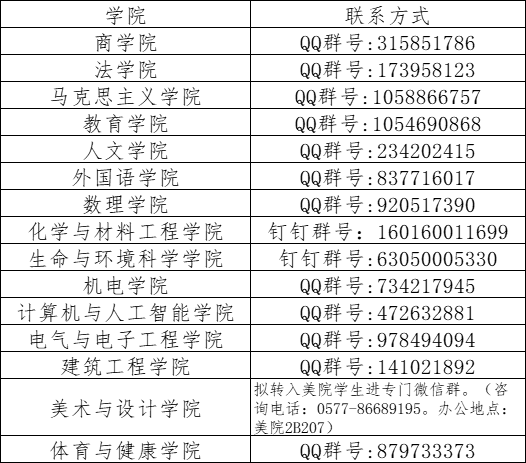 各学院已建立转专业工作专用群,如下表,相关申请转入同学请实名加群,及时关注群内通知。