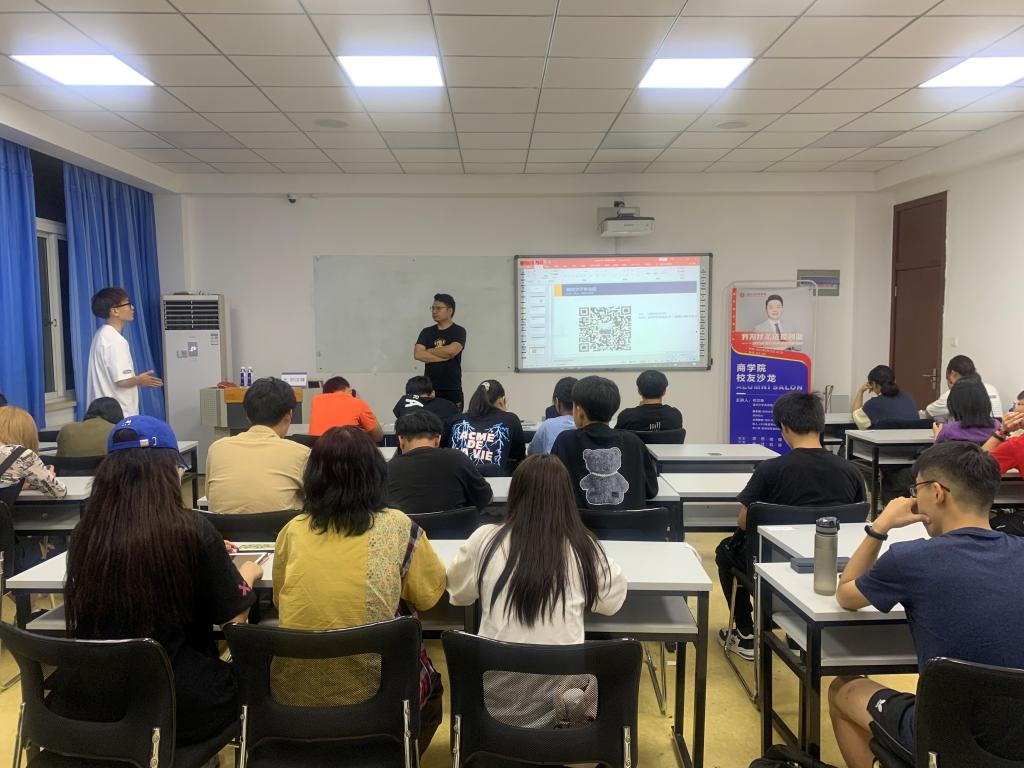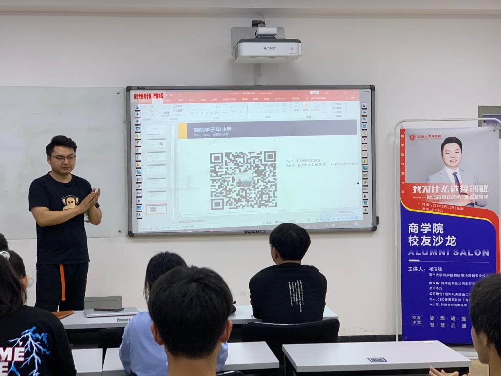 第四期校友沙龙活动在北3-307教室如期举行。18届市场营销专业优秀毕业生,绍兴凡决进出口有限公司创始人、CEO兼董事长祁汉锋校友受邀以“我为什么选择创业——一名90后独立品牌创业者的情怀”为主题和在校生们分享了自己的创业故事。现场吸引了40余名在校生热情参与。
