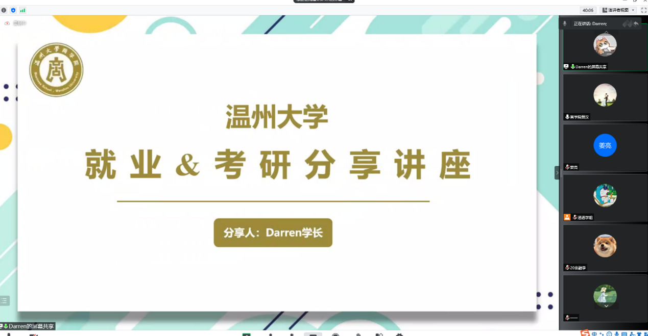 考研工作,并分析考研相关数据,鼓励大家积极报考研究生考试,一方面是提升自身学历层次的需求,另一方面也是学院人才培养质量的体现。接着,姜亮老师从分享自己的读研经历出发,引导大家认识清楚为什么要考研,理性分析考研背后的动机以及研究生毕业后的回报率问题。然后,Darren学长商科专业考研全程规划、如何规避复习误区、如何择校、选择合适的考研书籍、网课以及复试中应该注意的一些问题等方面展开介绍、重点就如何备战考研复习作了细致详细的说明,并耐心的解答同学们关于备考过程中遇到的各种疑难,同学们纷纷表示获益匪浅。
